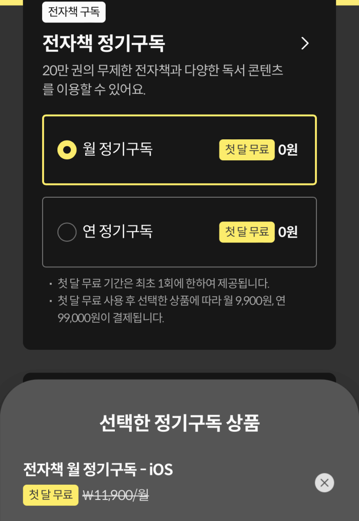- 아이폰으로 결제할 경우 부가세가 추가되므로(월 11,900원), 밀리의 서재 사이트에서 직접 결제하세요