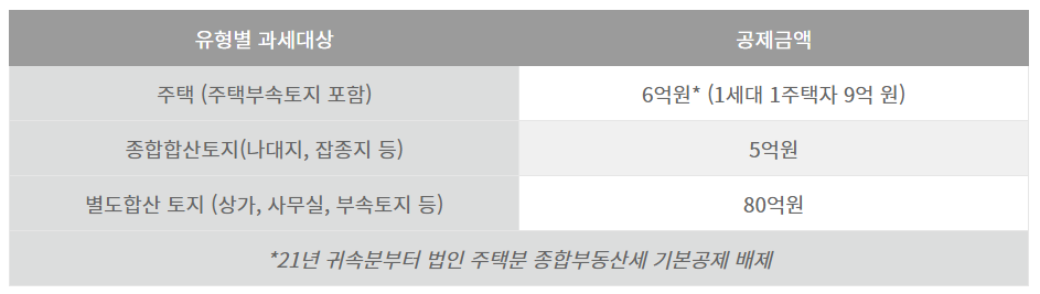 종합부동산세 과세대상은 6월 1일을 기준으로 하여 국내에 재산세 과세대상인 주택, 토지 등을 유형별로 구분해 개별 합산하여 공제금액을 초과한다면 세금을 부과해야 합니다.