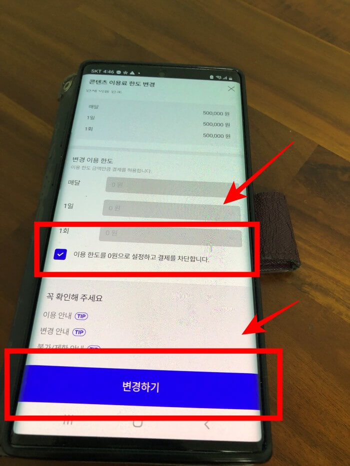 '콘텐츠 이용료 한도 변경' 화면에서 '이용 한도를 0원으로 설정하고 결제를 차단합니다'에 체크하세요. 그런 후 아래에 변경하기를 눌러 소액결제 차단 요청을 진행하면 됩니다.