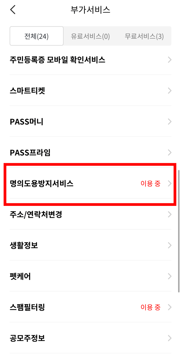• 부가서비스 > 무자 > 문자편리서비스 (또는 검색창에 '번호도용문자차단' 입력)